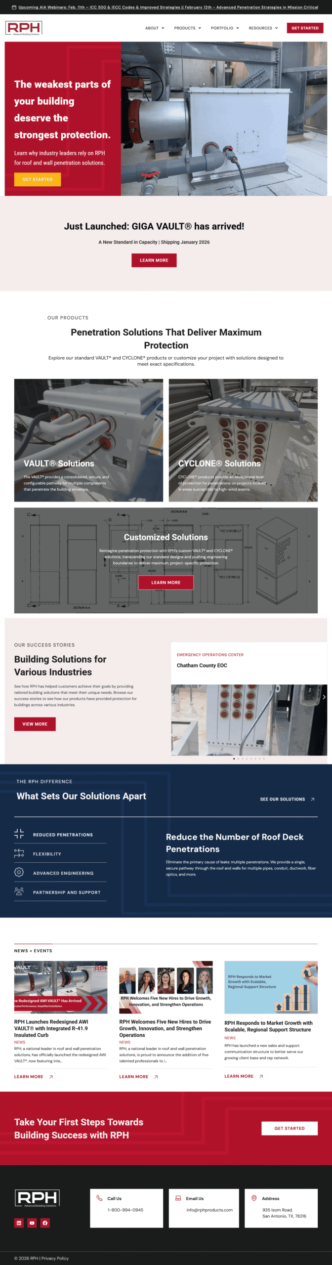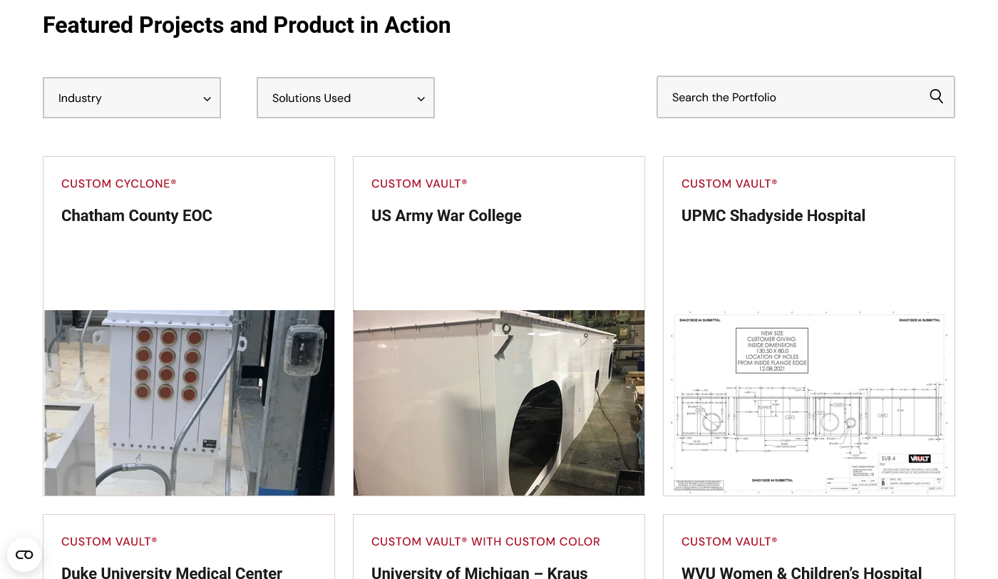 This section highlights real-world installations where RPH’s engineered penetration protection solutions have been successfully deployed across diverse facilities, including hospitals, universities, and data centers. Showcasing select projects with imagery and captions demonstrates how their VAULT® and CYCLONE® systems perform under demanding conditions, reinforces technical credibility, and helps visitors visualize the products in use. It builds trust with prospective clients by illustrating proven performance, application versatility, and the company’s ability to meet complex project requirements.