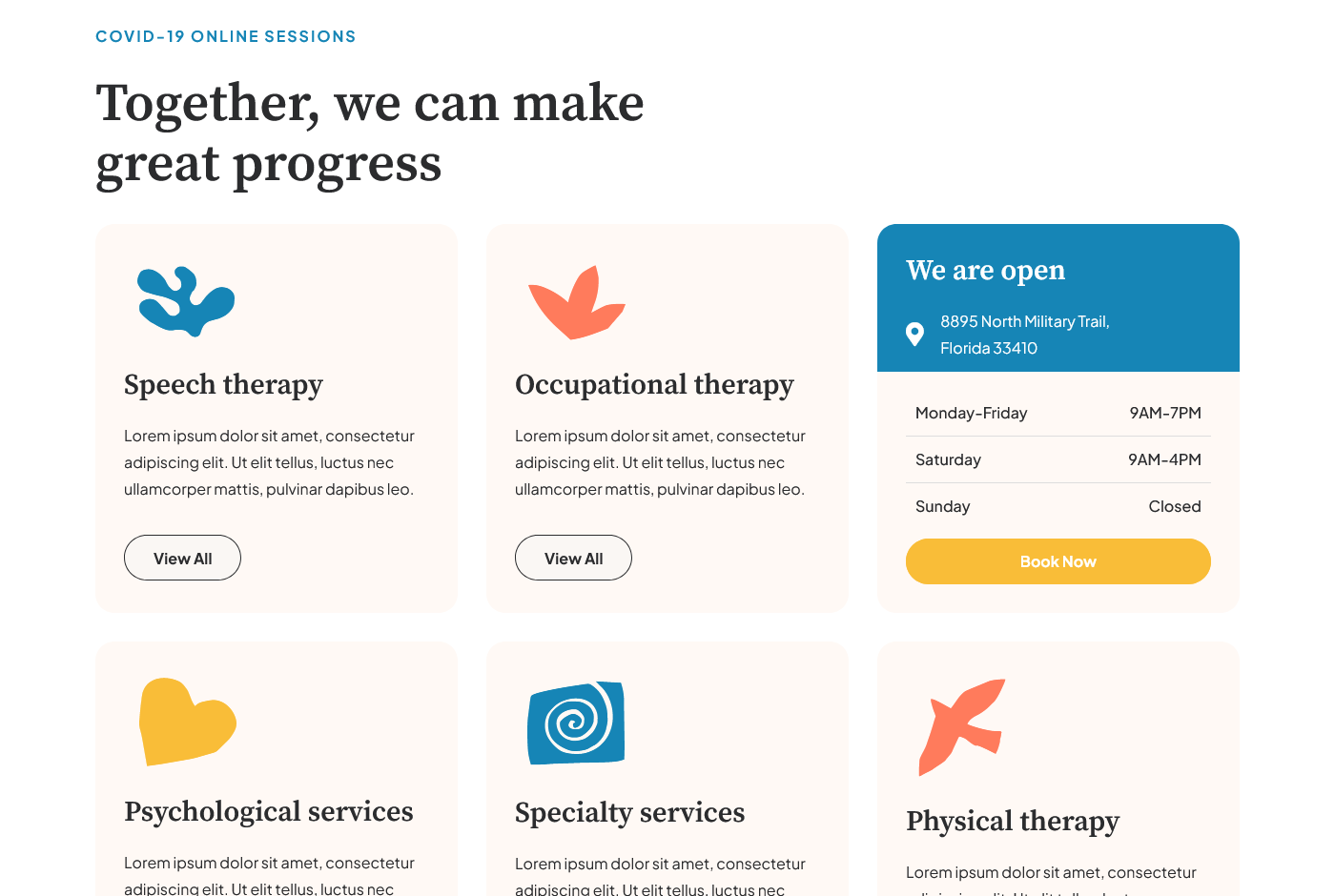 The site Health showcases a wellness and therapy services platform designed to present a comprehensive health centre offering multidisciplinary therapeutic support. The demo layout highlights core service categories such as individual therapy, occupational and speech therapy, specialty treatments, and telehealth options, complete with booking features and patient testimonials. The design includes clear navigation to sections like “About Us,” “Services,” an e-care shop, and professional exchange programs for clinics and staff. Although presented as a template, the structure reflects a professional healthcare provider’s needs, emphasizing accessibility, compassion, and easy appointment booking across diverse therapy offerings.