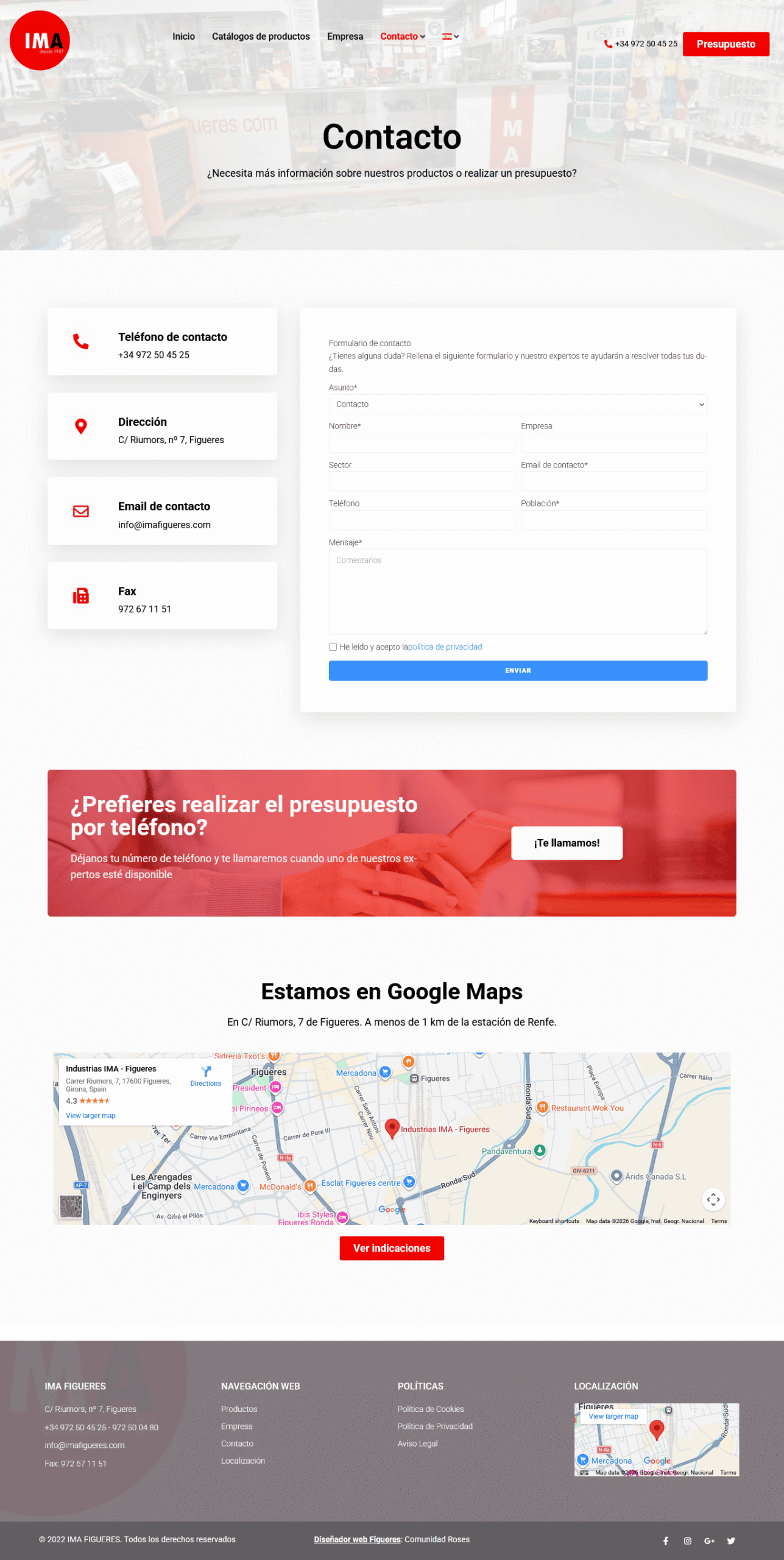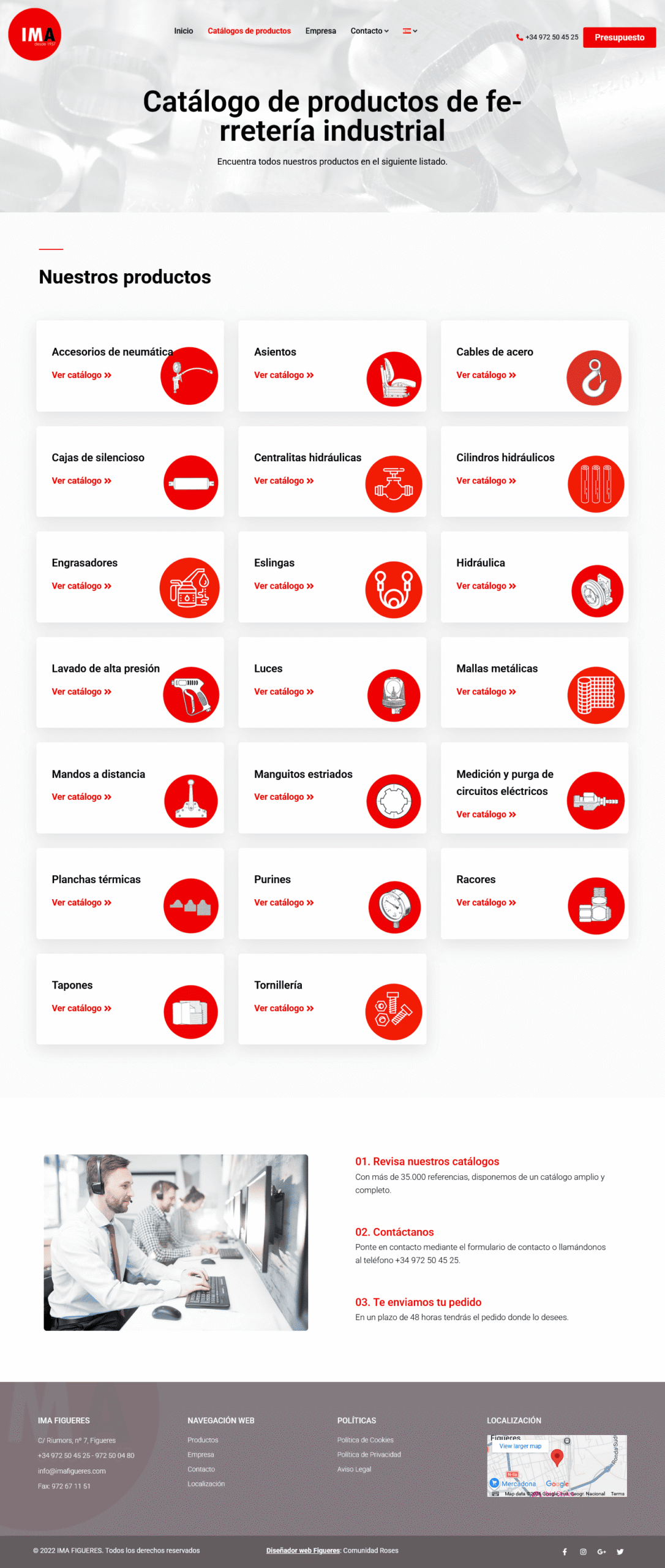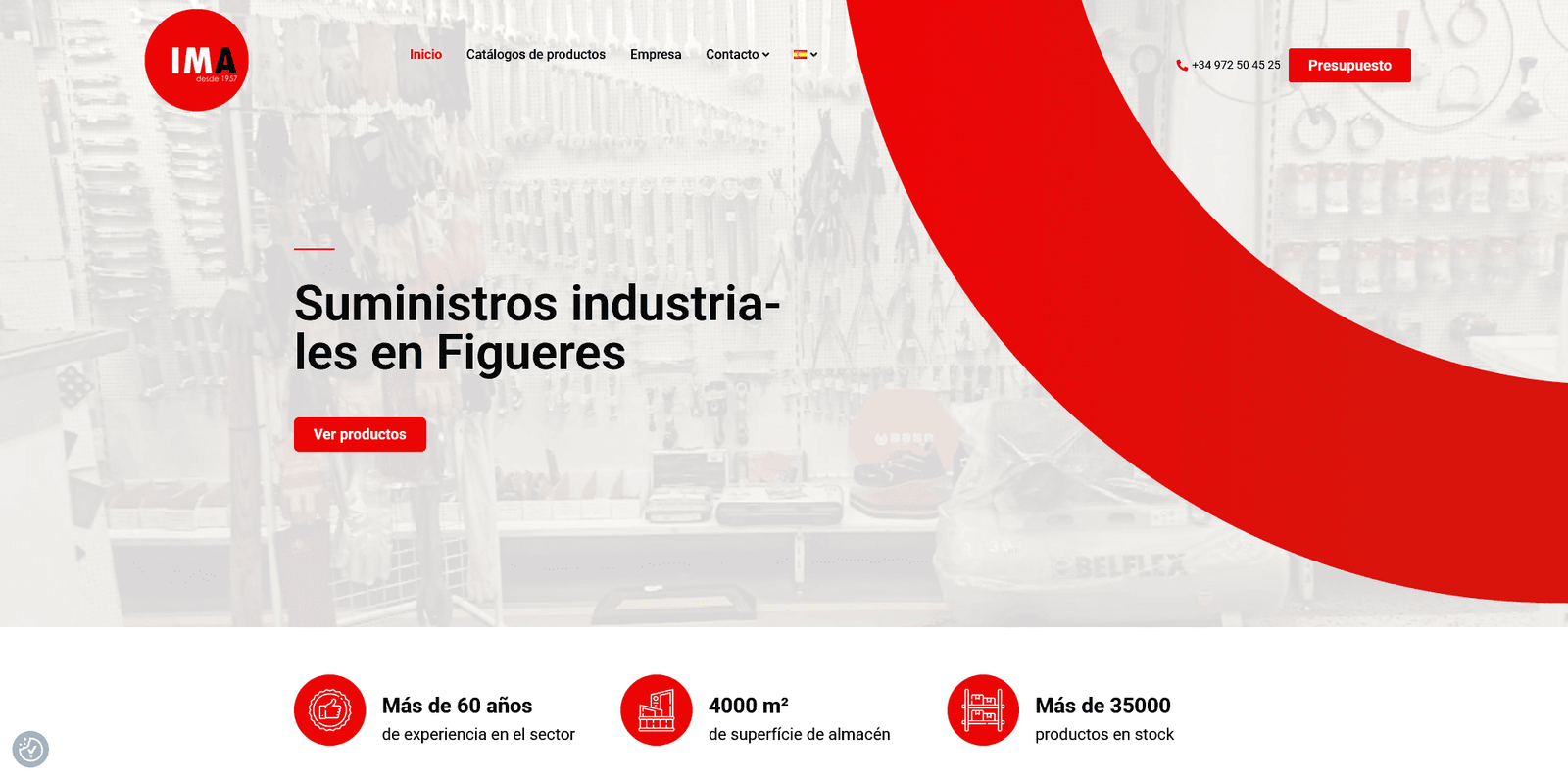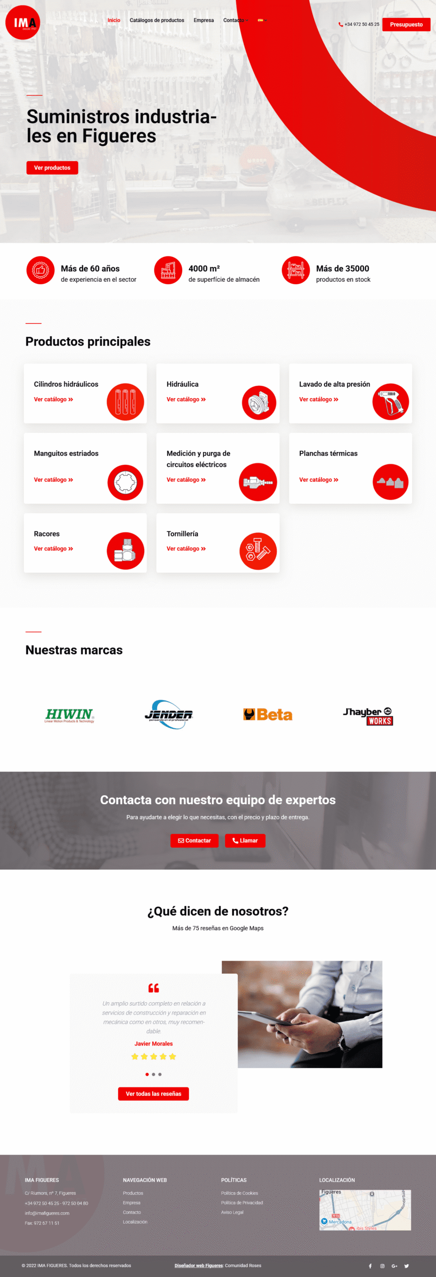 IMA Figueres is a well-established industrial supplies company based in Figueres, Spain, with over 60 years of experience in the sector. The website showcases their extensive catalogue of more than 35,000 products, ranging from hydraulic cylinders and fittings to high-pressure washing equipment and electrical circuit components, all available from a large 4,000 m² warehouse. It highlights the company’s manufacturing capabilities, repair services, brand partnerships, and expert support for customers. The site also features clear contact options and customer testimonials, helping to build trust and make it easy for businesses and individuals to request quotes or get product information directly.