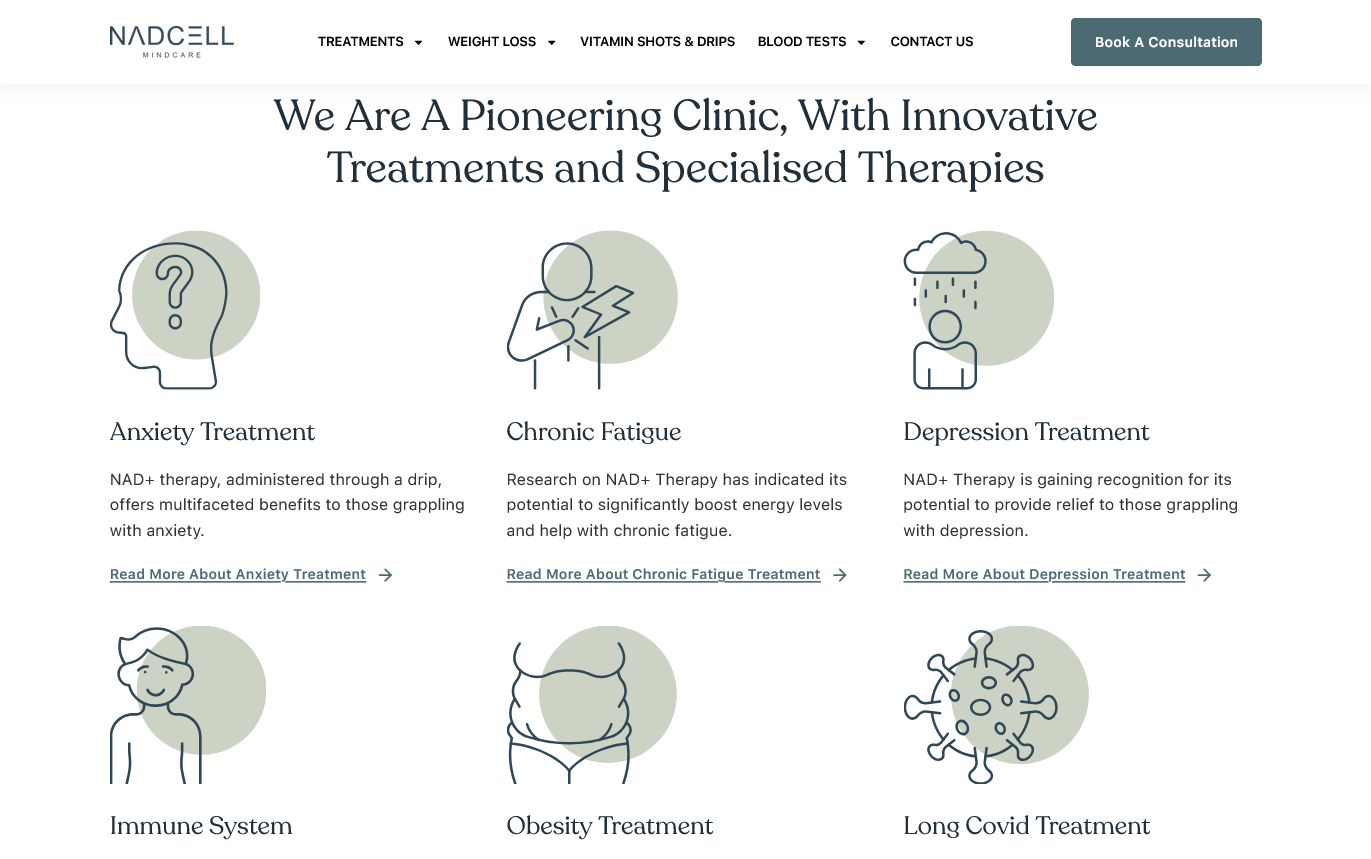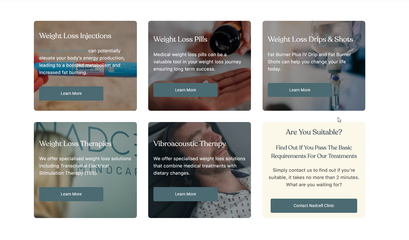 This section presents Nadcell Mindcare’s core treatment options in a visually structured grid, allowing users to quickly explore specialized services such as injections, pills, IV drips, and therapeutic solutions. Each card combines clear messaging with strong imagery and direct calls to action, making the offerings easy to understand and navigate. The layout improves scannability, highlights treatment diversity, and guides users toward deeper engagement, supporting both trust-building and conversion.