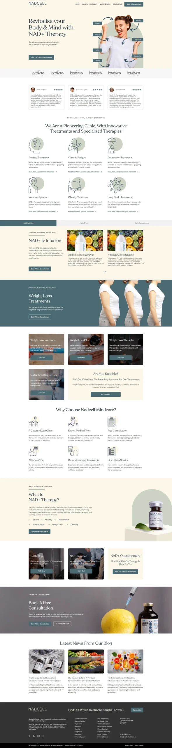 NADCell Clinic is a specialized wellness and regenerative therapy center dedicated to advancing holistic health and vitality through cutting-edge cellular treatments. The clinic focuses on personalized wellness solutions including NAD+ therapy, peptide therapy, vitamin infusions, and other regenerative protocols designed to support cellular function, energy levels, immune health, and overall well-being. NADCell Clinic combines evidence-based medical approaches with individualized care, helping clients optimize their health goals and recovery outcomes. The website highlights treatment options, benefits, frequently asked questions, clinic values, and clear contact information, positioning NADCell Clinic as a trusted resource for people seeking advanced, integrative wellness therapies