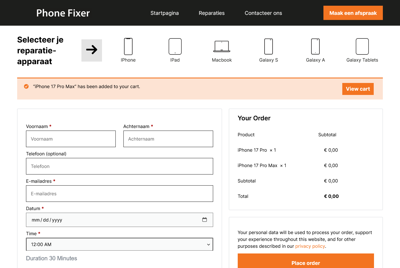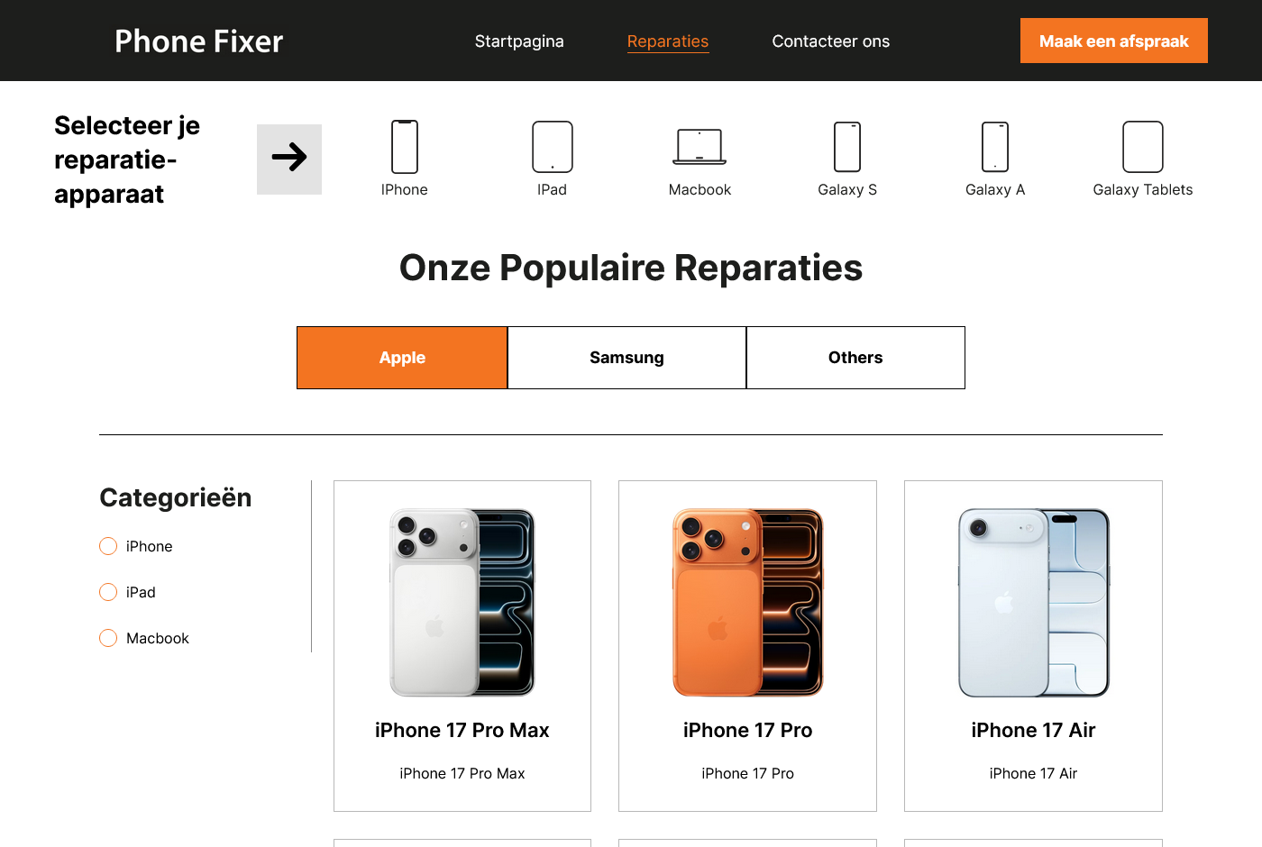 This website was developed on WordPress with a focus on usability, clarity, and conversion for local service bookings. I implemented a clean, responsive design that works seamlessly on desktops, tablets, and mobile devices, allowing visitors to quickly select their device type and repair need. Service pages were organized by device categories (such as iPhone, Galaxy, iPad, MacBook) using custom post structures and intuitive menus. Clear contact and appointment forms were integrated to support lead generation and user engagement. SEO-optimized headings and metadata were applied to improve visibility for local repair-related searches in the Netherlands, while performance enhancements keep page load times fast.