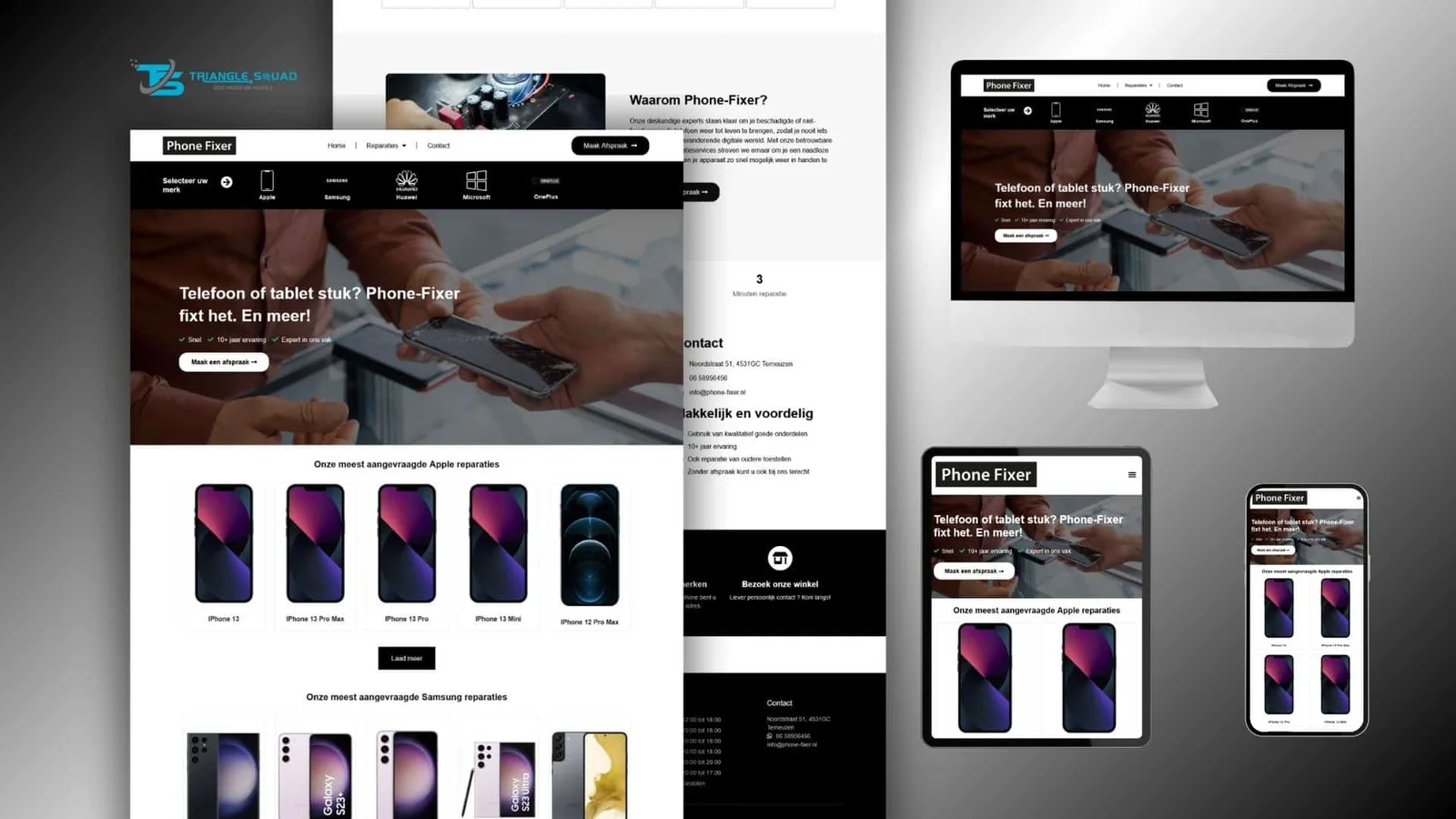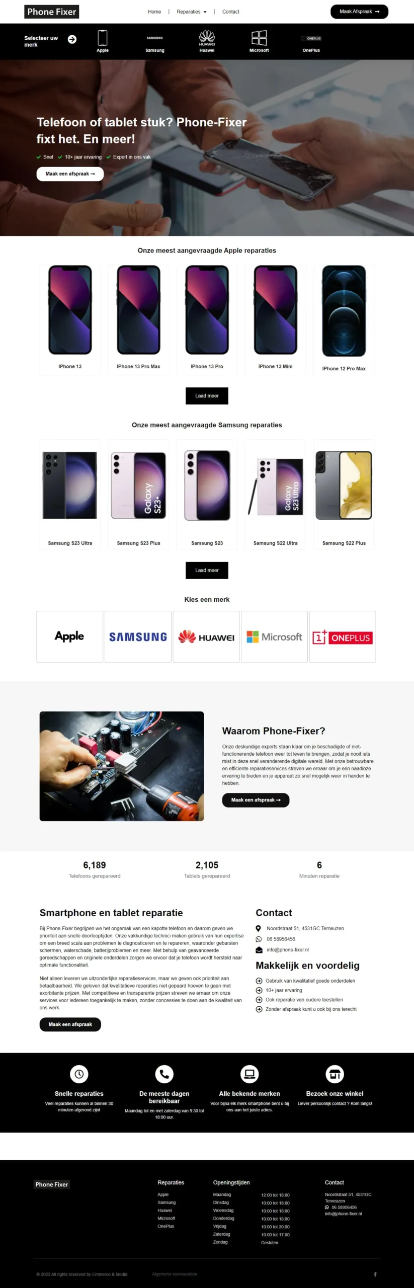 Phone-Fixer is a professional electronics repair service based in Terneuzen, the Netherlands, specializing in fast and reliable repairs for smartphones, tablets, and laptops — with a focus on popular brands like Apple and Samsung. The company offers a wide range of repair services including screen replacement, battery replacement, water damage fixes, and other technical solutions to restore device functionality quickly. Customers can choose their device type and book appointments directly through the website, while the on-site team of certified technicians ensures transparent pricing and quality service. Clear contact information and opening hours are also provided for easy customer access.