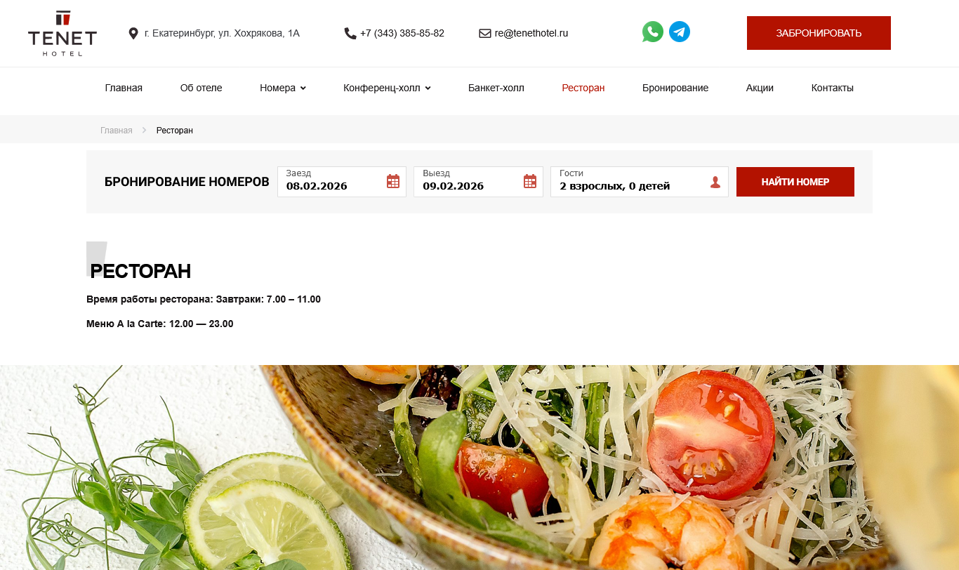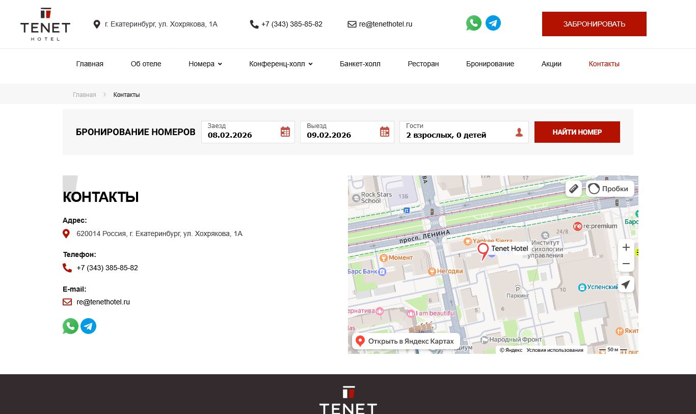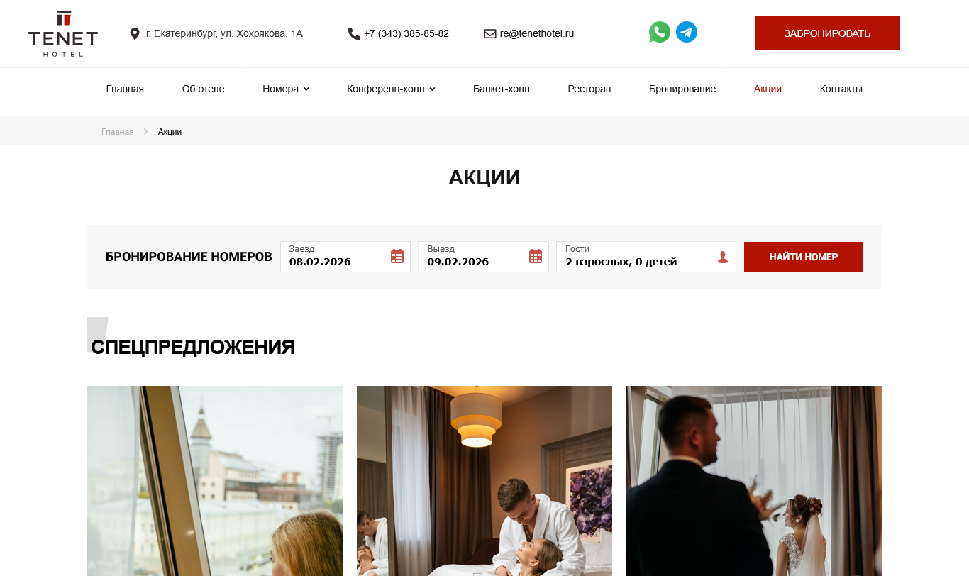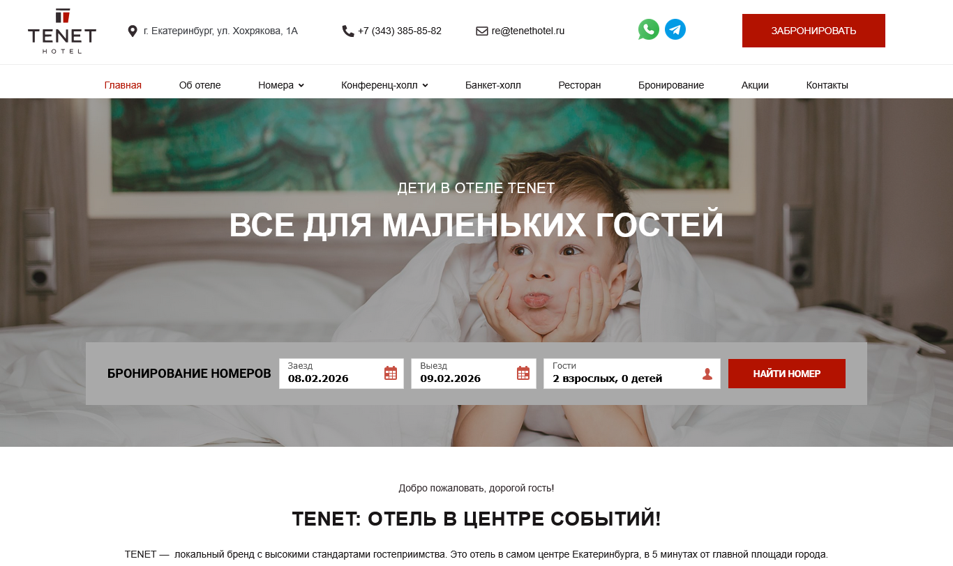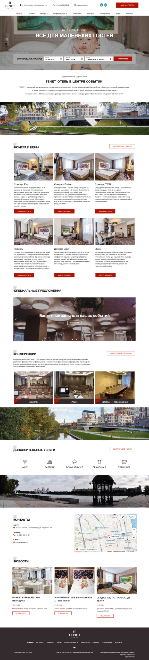 TENET Hotel is a distinguished hospitality brand located in the heart of Yekaterinburg, Russia. The official website presents the hotel’s offerings, including 89 stylish guest rooms from Standard to Junior Suite and Lux categories, designed for both leisure and business travelers. The site highlights amenities such as a European-style restaurant, conference halls, a ninth-floor banquet terrace, and services like Wi-Fi, room service, breakfast, laundry, and airport transfers. Special promotions like wedding packages and seasonal discounts are also showcased. With its prime central location near key attractions, TENET Hotel is perfectly positioned for exploring the city or hosting events
